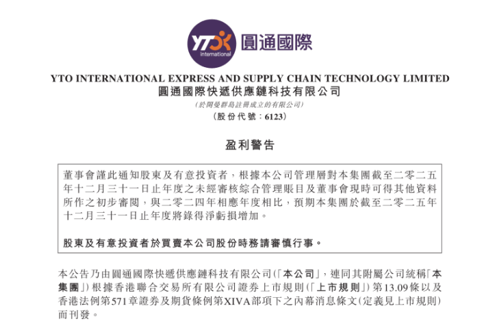 圆通国际快递称,与2024年相应年度相比,预期集团于截至2025年12月31日止年度将录得净亏损增加。集团预期于截至2025年12月31日止年度将录得净亏损介乎约1.45亿港元至1.54亿港元(截至2024年12月31日止年度:净亏损约4,200万港元)。净亏损增加的主要原因包括: