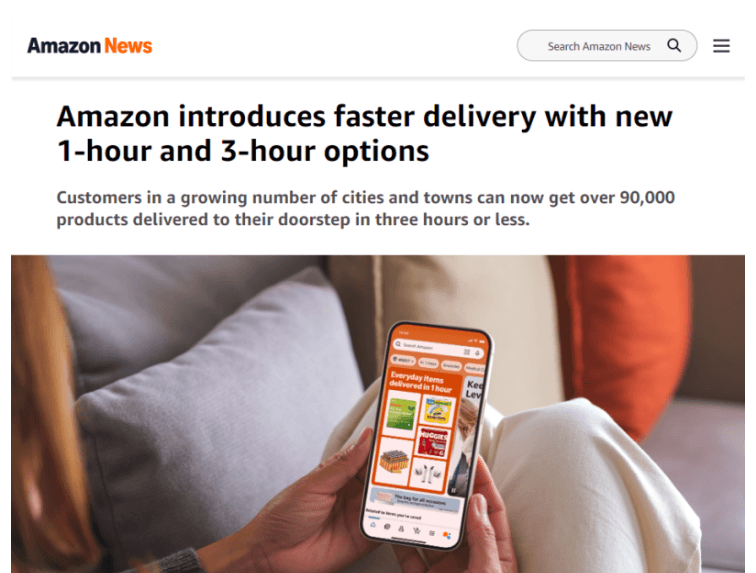 亚马逊宣布,在美国部分地区推出1小时和3小时配送服务,进一步加快物流速度,以满足消费者对更快收货体验的需求。目前,3小时配送已覆盖美国约2000个城市和城镇,而1小时配送已在其中数百个地区上线,包括洛杉矶、芝加哥、华盛顿等大城市,以及爱荷华州得梅因、爱达荷州博伊西等中小城市。