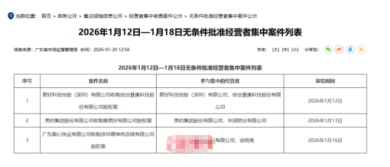 2025年12月22日,市场监管总局发布广东顺心快运有限公司收购深圳德坤供应链有限公司股权案。广东顺心快运有限公司及其关联实体(“顺心快运”,俗称“顺心捷达”)与深圳德坤供应链有限公司(“德坤供应链”)各股东方签订交易协议,顺心快运收购德坤供应链共计27.5%的股权。