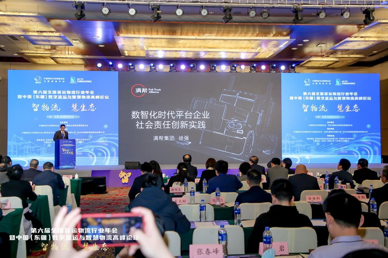 近日,主题为“智物流 慧生态”第六届全国货运物流行业年会暨中国(东疆)数字货运与智慧物流高峰论坛在天津召开。来自20多个省市政府部门、行业协会、数字货运平台等逾700名代表参加了会议。作为全国数字货运平台的代表,满帮集团党委书记、高级副总裁徐强应邀出席并做了题为《数智化时代平台企业社会责任创新实践》的主题演讲。
